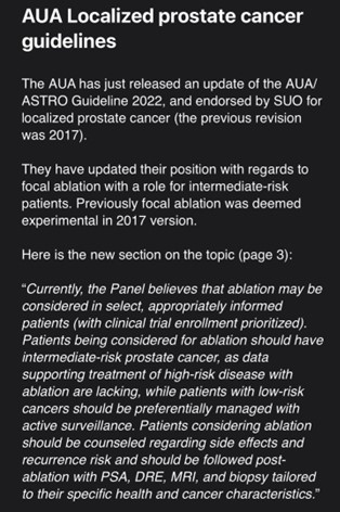 Dr Ariê: A AUA não atualizava o “guideline” de câncer de próstata localizado desde 2017. Durante estes anos muitos estudos demonstram consistência nos resultados em relação a segurança e eficácia da terapia focal. Dados mais recentes, utilizando os equipamentos mais modernos, têm mostrado resultados animadores no cenário do tratamento primário para casos selecionados de câncer de próstata.