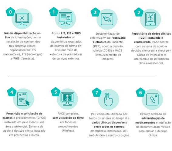 Basicamente, um hospital estágio 0 não possui nenhum tipo de sistema ou tecnologia que dê apoio à assistência ao paciente, enquanto uma instituição estágio 7 é um hospital digital, com intenso e amplo uso de tecnologias que dão suporte à assistência clínica e ao cuidado do paciente [2]. Abaixo seguem as principais especificações e passos no Nível 0 ao Nível 7 da HIMSS.