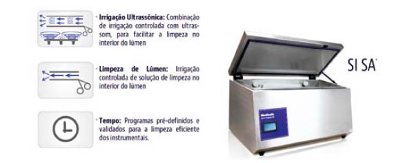 Em nosso portfólio você pode encontrar diferentes modelos de lavadoras ultrassônica, dentre elas a Sonic Irrigator Semi Automatic SISA da Medisafe. Com um sistema exclusivo e patenteado de irrigação interna em lúmen por bombeamento pulsante, a lavadora ultrassônica SISA possui duas bombas CPE® . A lavadora ultrassônica SISA possui duas bombas CPE, com adição de recursos que permitem rastrear e monitorar todo o ciclo de limpeza. Este equipamento provou ser capaz de limpar 12 instrumentos canulados em um único ciclo ininterrupto. A máquina vai encher, dosar o detergente, lavar, enxaguar e esvaziar com o toque de um botão, o que faz este sistema versátil e fácil de usar.