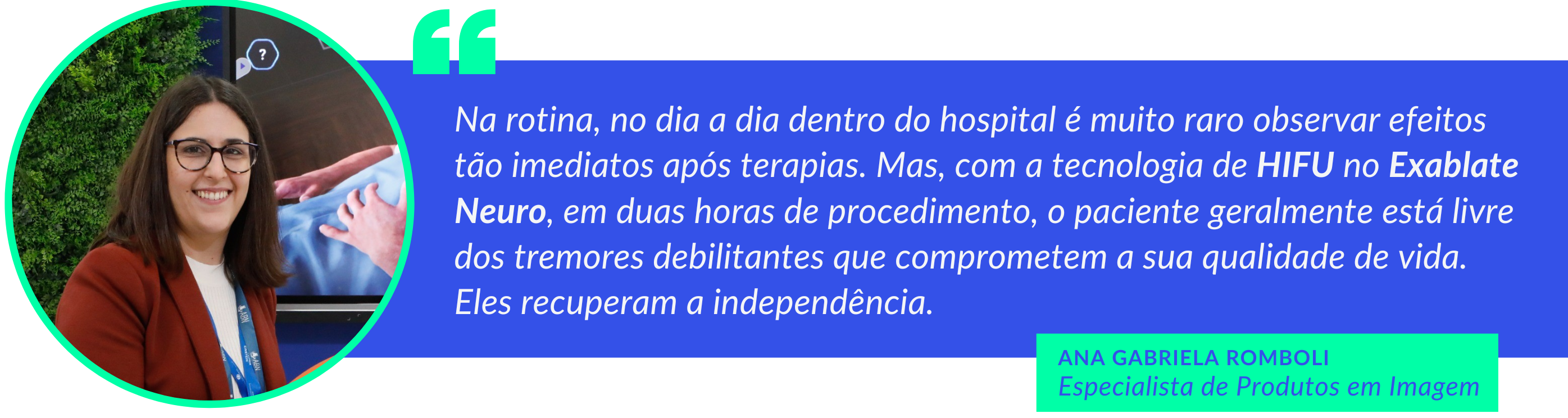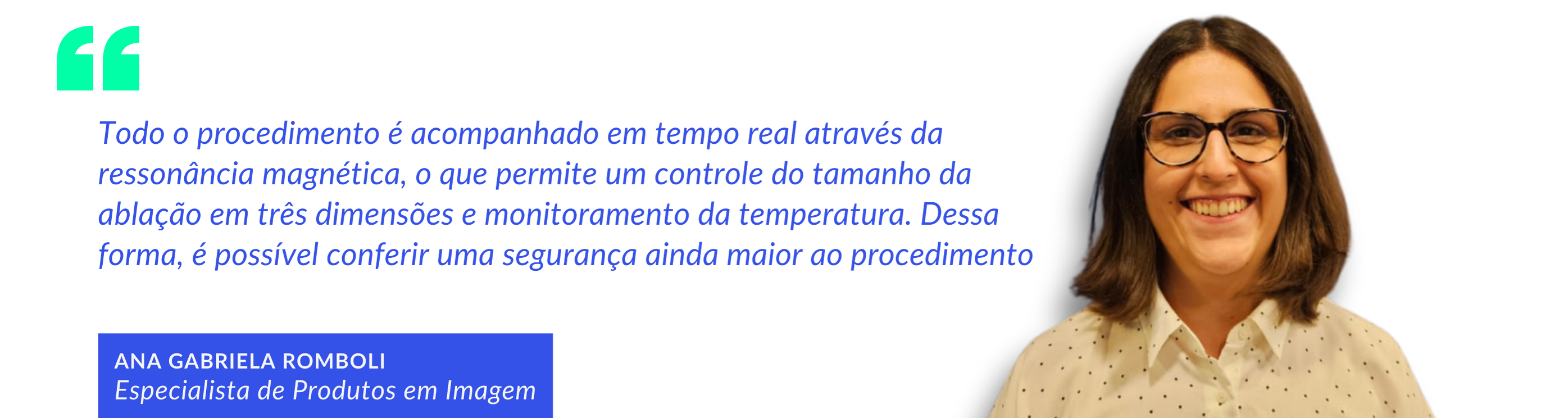 Ana Gabriela Romboli, Especialista de Produtos da Strattner, acompanhou alguns procedimentos realizados em Centros de referência nos Estados Unidos (NY Presbyterian, Hackensack Meridian Health, Novant, UNC, Duke University, UVA e UPenn) que utilizaram o equipamento e conta um pouco do seu funcionamento: “o sistema conflui duas tecnologias, a ressonância magnética, por onde é feito o acompanhamento da temperatura e da imagem, e o ultrassom focalizado de alta intensidade (HIFU), responsável por realizar a ablação”.