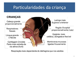 A via aérea pediátrica possui certas particularidades que dificultam a visualização no momento da intubação. Os pacientes pediátricos têm uma cabeça proporcionalmente maior ao corpo e, se não acomodada corretamente no momento do procedimento, ela pode ocluir a via aérea. Além disso, a mandíbula é pequena para acomodar a língua, órgão naturalmente grande em pacientes pediátricos. As cartilagens aritenóide, cuneiforme e corniculada, são conectadas através de ligamentos e membranas. Nas crianças, essas conexões são imaturas predispondo ao colapso da região. A epiglote é mais longa e mais fechada, dificultando tanto na visualização como na introdução do tubo.