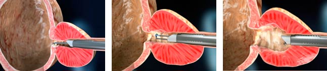 Esquema demonstrando o procedimento de RTUP, com a entrada do endoscópio pelo canal uretral e retirada do tecido prostático com uso de alça de ressecção.