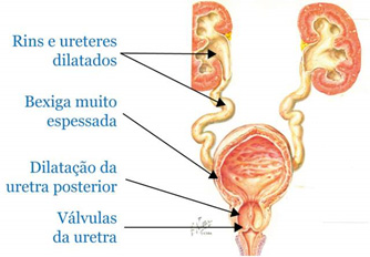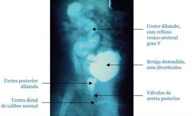 - Uretrocistografia miccional: deve ser realizada tão logo as condições clínicas permitam, pois confirma o diagnóstico. Os achados são de dilatação da uretra prostática, hipertrofia do colo vesical, pouco fluxo distal, bexiga irregular e refluxo vésico-ureteral.