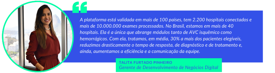 “Durante um episódio de AVC, cada minuto conta muito. Portanto, pensando nos pacientes, a rápida assistência aumenta a chance de sobrevivência e diminui as possíveis sequelas. A RapidAI aumenta a janela de tratamento por meio cirúrgico (Trombectomia Mecânica) de seis para 24 horas, através do uso de protocolos DAWN (pacientes entre 6-24 horas) e DEFUSE3 (pacientes entre 6-16 horas)”, diz Talita.