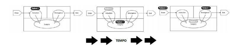 Esquema mostrando o fluxo de pacientes e procedimentos durante o tempo em sala cirúrgica