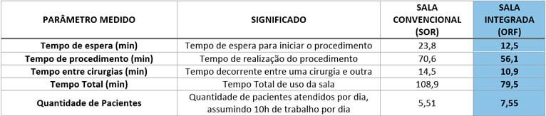 No estudo foram coletados dados durante um ano de procedimentos realizados na sala integrada (ORF), comparando-se sempre com os mesmos tipos de procedimentos realizados na sala cirúrgica convencional (SOR). Os resultados mostraram que a sala cirúrgica integrada (ORF) teve uma melhor performance quando comparada com a sala convencional (SOR). A Tabela 1 abaixo mostra os resultados de todos os parâmetros medidos.