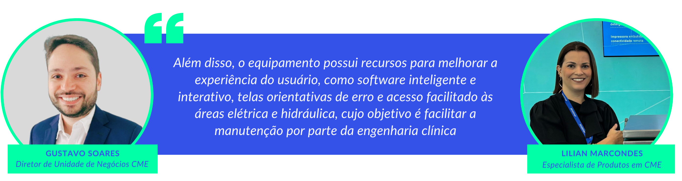 Gustavo Soares, Diretor de Unidade de Negócios CME, e Lilian Marcondes, Especialista de Produtos CME, defendem que o principal avanço da tecnologia é a otimização das funções básicas com estratégias, como o reposicionamento de transdutores para melhor distribuição da atividade ultrassônica na cuba, bomba jet mais potente, e aquecimento da solução duas vezes mais rápida que a média do mercado.