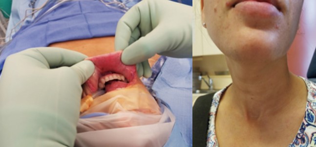 Figura 1: Acesso transoral vestibular e resultado pós cirurgia. FONTE: RAZAVI, Cristopher et al. (2018. pág. 02).
