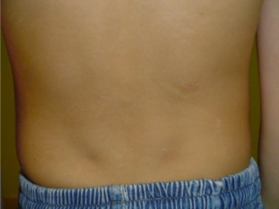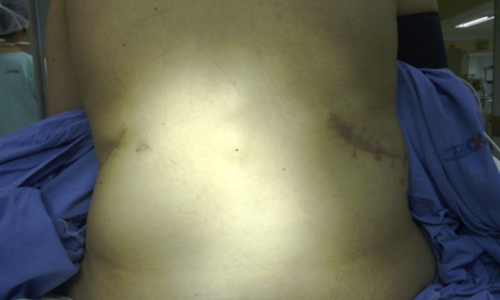 Figura 1 – paciente tratada para cálculo renal por cirurgia convencional, com grandes cicatriz no lado direito; à esquerda cicatriz de 1cm de cirurgia percutânea