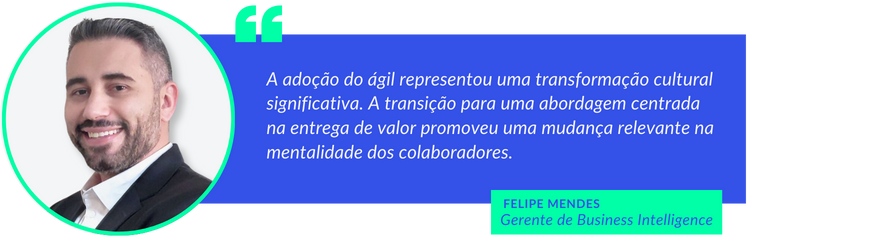 “O mercado de saúde está cada vez mais dinâmico e precisa se adaptar rápido a mudanças. O ágil nos ajuda a fazer a melhor gestão de projetos e processos, gera mais valor e resultado para a organização e clientes”, explica Felipe Mendes, Gerente de Business Intelligence.